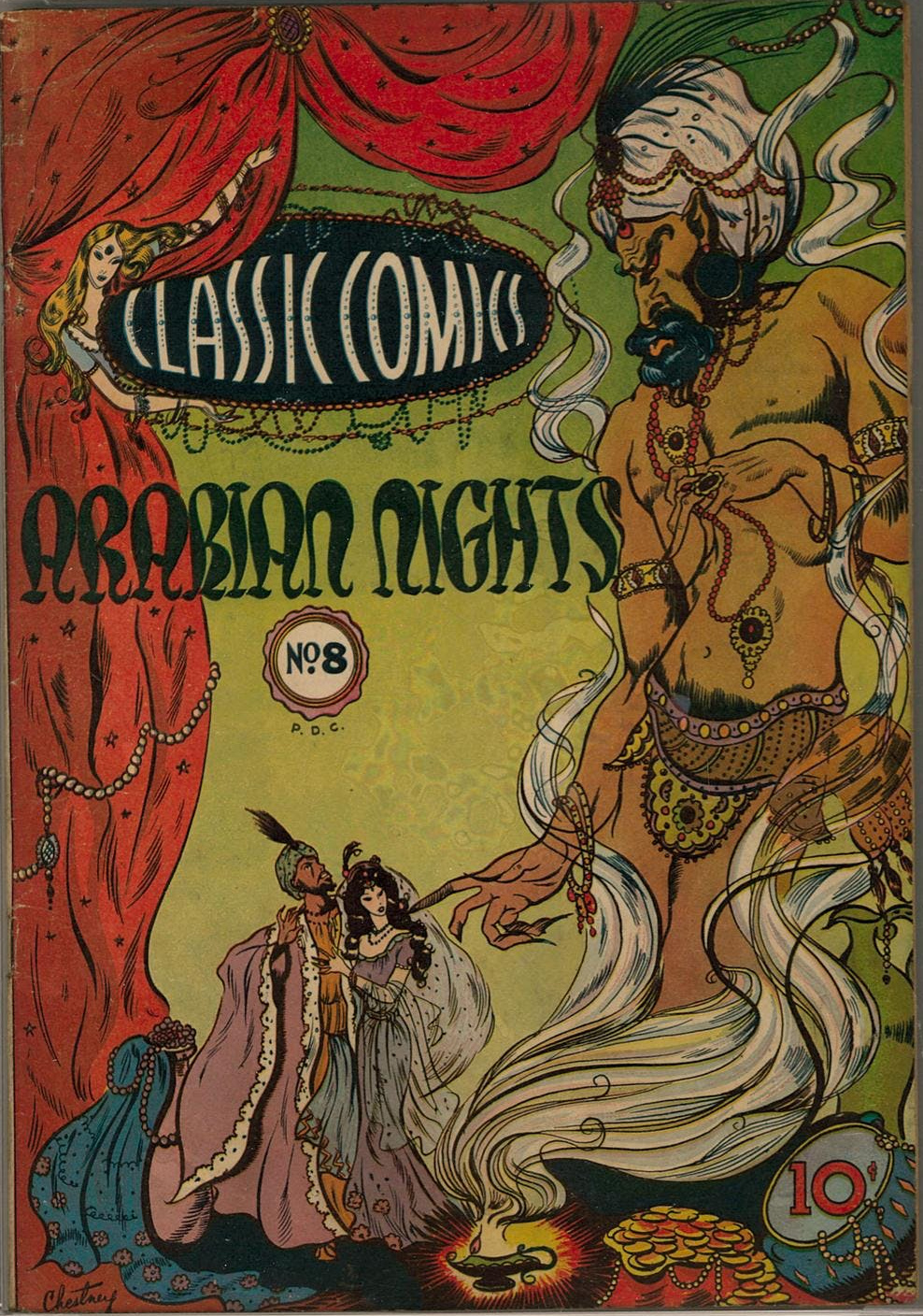 Great whimsy cover by early female comic book artist Lillian Chestney. Controversy over the Djinn’s pubic hair in the original and the 2nd print (HRN 17). From the 3rd print (HRN 28) on the pubic hair was removed from the art.