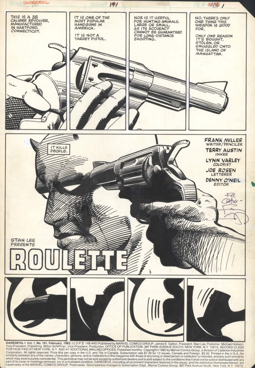 Daredevil issue 191 splash by Frank Miller and Terry Austin. Source.