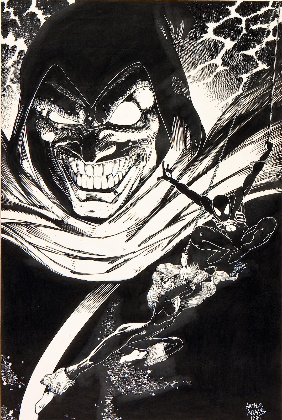 Spider-Man, Black Cat & Hobgoblin pin-up by Art Adams. Source.