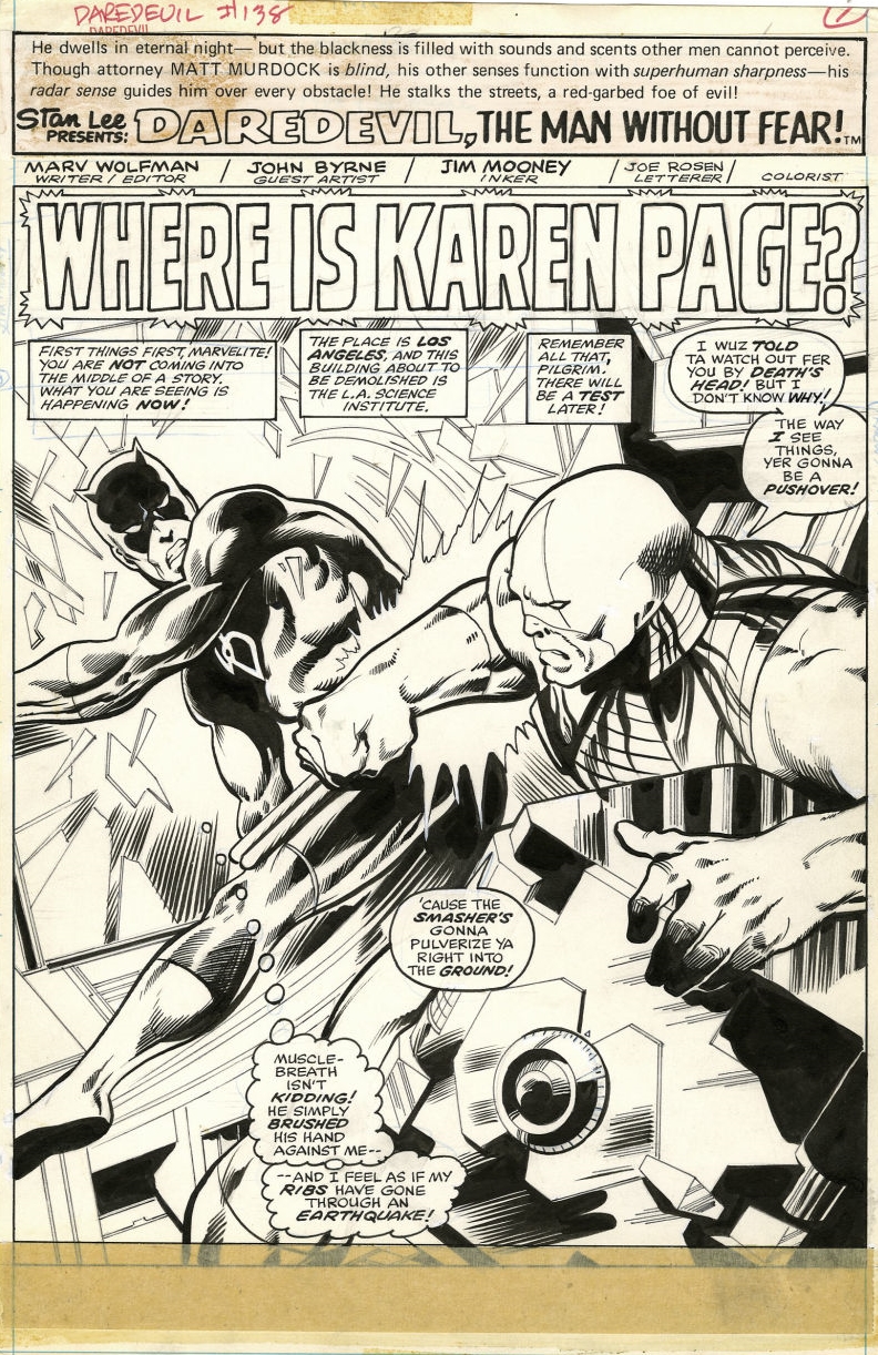 Daredevil issue 138 splash by John Byrne and Jim Mooney. Source.