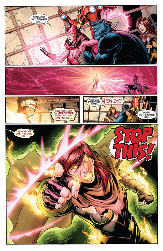 Following the events of previous installments of the story –spanning many tie-in issues, as well as the main title itself– we find Hope with the Avengers in the mystical city of K’un-L’un. At the end of the previous issue, Cyclops had arrived and demanded that Hope return with him to Utopia. Attempting to blast Hope, Iron Fist pushes her out of the way, saving her from Summers’ Phoenix powered optic blast. Iron Fist attempts to subdue Cyclops but is stopped and quickly cast aside. The plot point actually proves to be crucial, as simultaneously Hope runs for a cave to meet Lei Kung at the suggestion of Iron Fist, while Iron Man swoops in to delay Summers’ advancement. While Cyclops fights the Avengers on K’un-L’un, on the earthly plane, we find Captain America and Professor Xavier in Russia, discussing the state of mutant affairs. The page feels as a set-up to re-implant Xavier as the chief figure in the mutants’ corner of the Marvel Universe. To what end this plays out is unclear, but Xavier’s return to the forefront in the last several issues may lead to bigger things for a character which has for the most part fallen by the wayside over the last five years. Making it clear he believes Scott and Emma are wrong, it pits them opposite to each other metaphysically, making for an interesting dynamic that could form after the series’ conclusion. The seriousness of Xavier’s worry plays out in the following pages as we find that the Phoenix empowered Emma Frost has seemingly taken some of her teammates captive, much to the chagrin of Magneto who remarks on her actions, before being put in his place by the former White Queen. Another potential nod to the end of the series comes as Magneto, on his knees, peers towards his helmet. Combined with the final page of the issue, it’s foreseeable that Xavier and Magneto will work together to end the Phoenix’s threat.