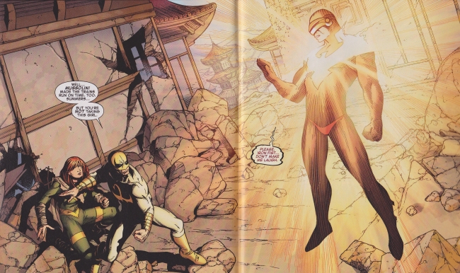 Kubert’s artwork truly helps define the immensity of this book’s scope. His work in this issue spans multiple locations, each possessing finely detailed characters, environments and an aptitude to create amazing elemental effects when combined with the work of inker John Dell and colourist Laura Martin. The opening two pages are a testament to this, as Cyclops fires at Iron Fist and Hope with his optic blast. A yelling Iron Fist leaps in to push Hope out of the way, moving her from Cyclops’ line of fire just as his blast connects with a nearby stone. The stone shatters as the environment is engulfed in a sea of red, the bodies of Iron Fist and Hope illuminated by the ruby redness of his energy attack. Martin did a fantastic job in the upper panel, not only shading the immediate environment in the red hue, but additionally she extends fine streaks of red across the ground, peering ever so slightly above nearby rocks. The page is completed by Dell’s inks which defines the total brightness and power of Cyclops’ energies. Kubert and Martin again come together on the following page. The page is illuminated by the Pheonix’s power, embodied by a blinding light illuminating their immediate area. Kubert’s attention to detail, from the disposition of Iron Fist, to the nonchalance of Cyclops, down to minor structural touches such as the damaged buildings that clearly allow you to see through the debris holes and through to the other side, are testaments to Kubert’s pencil work. Another fantastic panel features Iron Man flying at full speed into Cyclops, streaks of wind and energy trailing behind him; Martin and Kubert again demonstrate a knack for bringing the environment to life regardless of the panel’s composition. From the icy, watering eyes on Captain America, to the immense awesomeness of Shou-Lao, the immortal dragon, the artwork in this issue is worthy of praise in all respects.