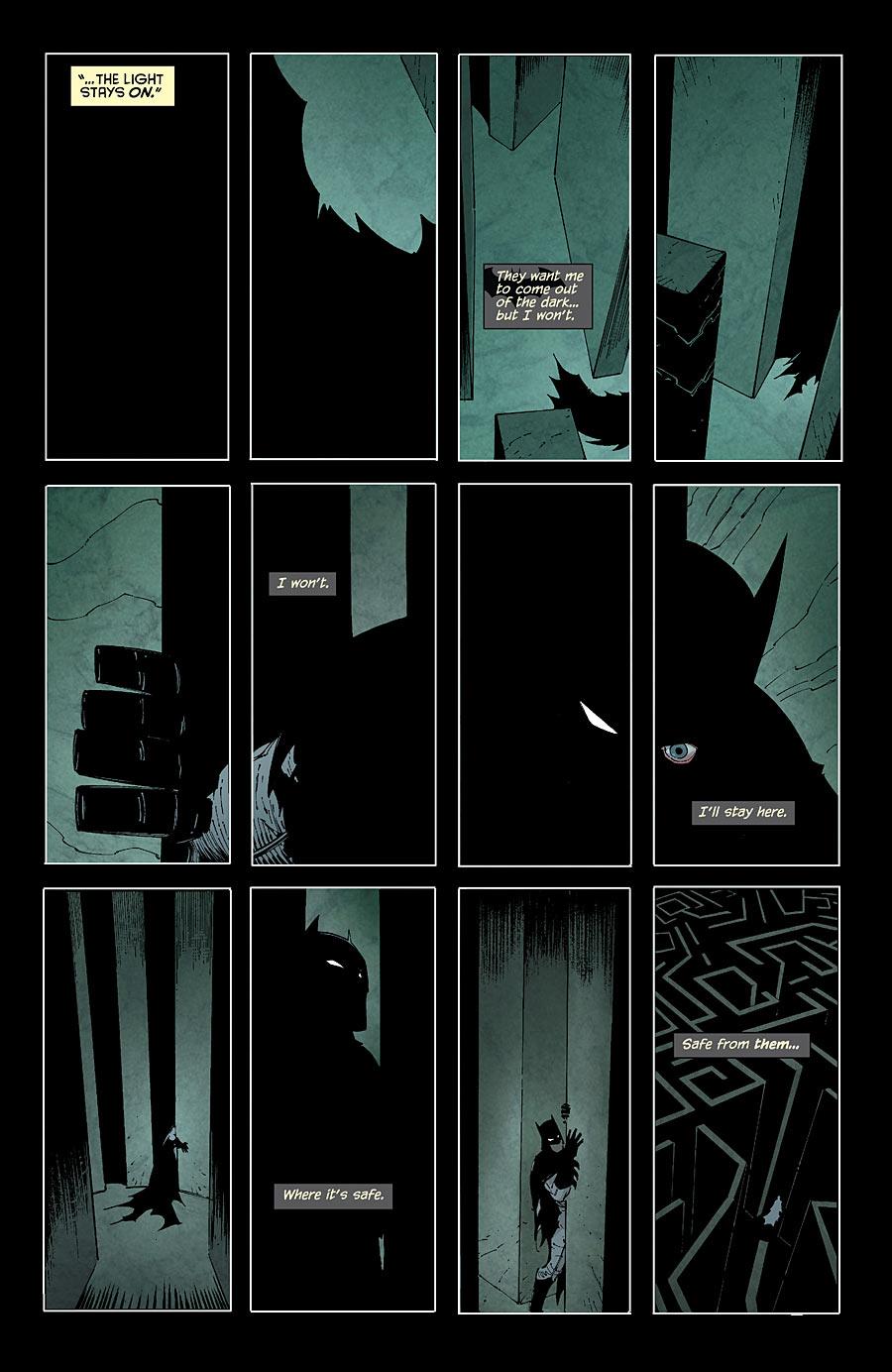 In the week since his disappearance, the GCPD has maintained a constant vigil for Batman in the form of keeping the Bat-Signal lit. Meanwhile, Nightwing, Robin and Batgirl run themselves into exhaustion as they search for their mentor, while Catwoman worriedly gazes up at the signal high up in the Gotham sky. Elsewhere, Batman stumbles through a maze in the darkness, opting to remain in the shadows where the Court cannot find him. It is all for naught, as the lights turn on as he enters a room revealed to be pristinely white with a large statue of an owl guarding a small water fountain. He hurriedly gulps some of the water despite his better judgement, and continues onward to find a small memorial room decorated with plaques containing photographs of past targets of the Court. With insanity seemingly gripping him, Batman smashes the lens of a camera in the middle of the room and quickly retreats to the darkness. Down a corridor, he spies a group of individuals wearing white owl masks. Quickly giving chase and pronouncing his discovery of their existence, Wayne finds the illusion to be another trick of the maze, stumbling upon another lightened room with the surnames of many of his adversaries’ and allies’ ancestors from Cobblepot to Gordon engraved on the walls. In an adjacent room, Bruce investigates rows of coffins, each with a picture of a child placed on the top-centre of each. An open, empty coffin sends Batman reeling into another room, his senses overwhelmed by the realities barreling down on him. While reconciling with the revelation of the order’s existence, The Talon impales him from behind at the exact moment the Bat Signal bulb shatters on the rooftop of the GCPD building.
