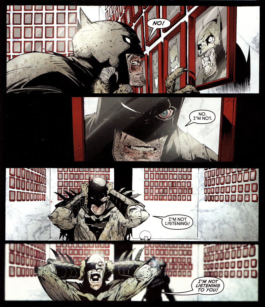 Artwork is everything to a comic, and Capullo finds the delicate balance between presenting highly detailed pencil-work with much going on in the panels without making them look boring or uneventful. Each panel in the issue is interesting, with work ranging from Commissioner Gordon and Bullock standing on the GCPD building awaiting the arrival of Batman, a worried look enveloping Gordon’s face, to the visibly shaken Damian and his increasing worry over his father’s disappearance. With the majority of the issue taking place inside the Court’s maze, the artwork jumps back and forth between light and dark, stressing the importance of the inking work supplied by Glapion. Thematically the contrast presents itself visually. Mirroring Snyder’s premise of light and dark, the owl being a predator of the bat, the art moves seamlessly between the shadows Batman seeks refuge in and the fully illuminated white rooms of the labyrinth. Capullo expands his palette of creativity a little further at various junctures of the issue, notably the sequence of pages where Batman moves from room to room. In one case Bruce gazes at a photograph of an old man; Capullo situates the panel rather well with Bruce’s reflection and the old man’s visage composing a Two-Face type dichotomous dynamic. It’s almost as though Bruce envisions himself in the man’s place amid his fluctuating sanity. In addition, stepping away from the nuanced creativity of the panel work, Capullo and FCD composed some fantastic artwork later in the issue when the owls begin to tear Batman’s costume from his body, or how in various pages we see The Talon close in quiet pursuit of his prey, creeping in the shadows Batman clings to so desperately until finally he attacks Bruce at the end of the issue. Batman #5 bookends the installment with another appearance atop GCPD headquarters, whereby it appears the signal shatters at the precise moment Batman is stabbed, bringing this book and its fantastic artwork to a close.