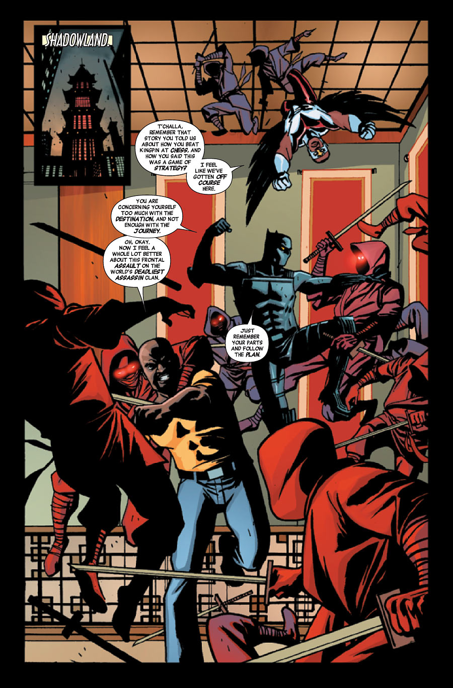 In the heart of Shadowland, Panther, Luke Cage and Falcon go to toe to toe with Kingpin’s ninja assassins as they wage their assault on Wilson Fisk’s stronghold. Enraged, Kingpin orders one of his trusted confidants, Miyu, to delete sensitive information from a flash drive before turning to Lady Bullseye and Typhoid Mary and sending them to detain Falcon and Luke Cage. With everyone else inside Shadowland resorting to fisticuffs, two ninjas are alerted to unauthorized access to the stronghold’s mainframe. A group of ninjas quickly leap through one of the walls housing Shadowland’s computers and attacks Miyu, whom after dispatching the three ninjas, reveals herself to be Shuri, T’Challa’s sister and current Black Panther. Elsewhere, Cage and Falcon gain the advantage on Typhoid Mary and Lady Bullseye with a little help from Shuri. Together they run off in search of T’Challa and Kingpin, following the thuds and crashes throughout the complex until they find the two fighting hand-to-hand across several rooms. Once T’Challa’s allies arrive, Kingpin’s ninjas emerge from the darkness to surround their master. Upon revealing Shuri’s role in T’Challa’s plan, Kingpin allows them to leave so as to avoid further ruin. One week later, T’Challa and Matt Murdock are standing atop a building in Hell’s Kitchen discussing recent events, briefing him before they part ways. Walking into his diner, he finds Sofija waiting for him. After a short chat, T’Challa runs off into the night in search of one thing before leaving town: trouble.