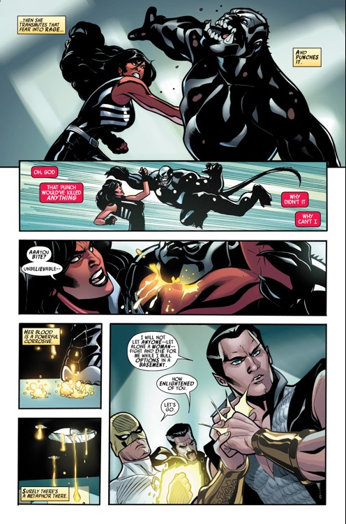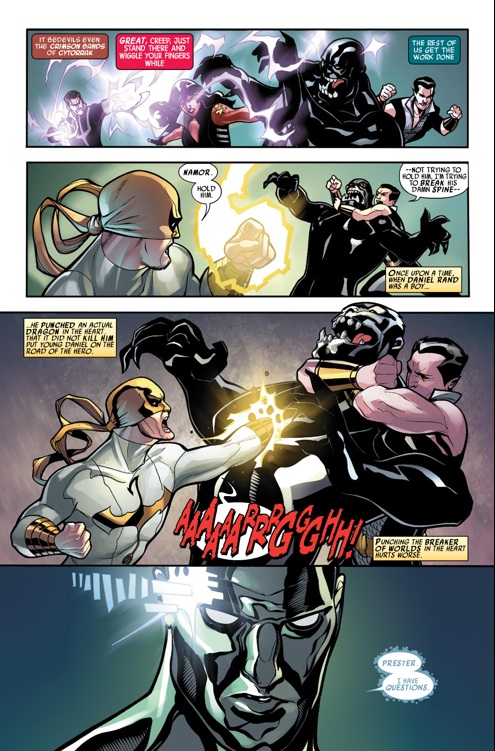 I traditionally dislike the work the Dodsons do, having been overjoyed upon their departure from Uncanny X-Men. Surprisingly, although I dislike some of the work in the issue, I enjoyed some of what they had to offer. There are times where the characters seem very static, boring or statuesque, while in the case of Red She-Hulk, she bears resemblance to Emma Frost, Rogue and Kitty Pryde from their X-Men contributions. The minor differentiations between them exhibit a dearth of creativity, leaving the Dodsons’ females with very much the same body type. I did however enjoy a lot of their Silver Surfer work, of which I would call the best offerings within the issue. I think they did a great job of presenting him in the little panel time he had, while the last few pages featuring Nul’s removal from existence and Iron Fist and Namor tag-teaming Nul were very cool pages.