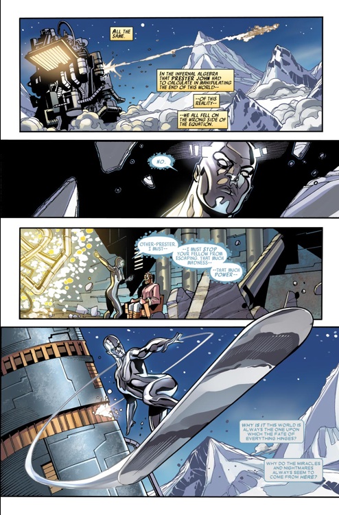 Deep within Wundagore Mountain, Nul, the Breaker of Worlds, rampages forward to the secret heart of the mountain, destroying everything in his path. Nul is confronted by the Defenders as he plods towards his goal, confronted first by Red She-Hulk before Namor, Dr. Strange and Iron Fist resolve to join the fray. While Namor holds Nul in place, Iron Fist punches Nul in the chest. It continues forward, despite their attacks while Silver Surfer tries to uncover the connection between John and Nul by speaking to one of the Prester John copies. Realizing the original John is attempting to escape, Silver Surfer gives chase. As the Silver Sentinel flies off, Nul, undeterred, devastates the Defenders and arrives at the machine. He begins hitting the device, as reality shifts around him. A John copy rises from his chair, and for the sake of protecting the universe, erases Nul from existence. As Silver Surfer reaches John’s ship, the rest of his teammates decide to steal the machine.