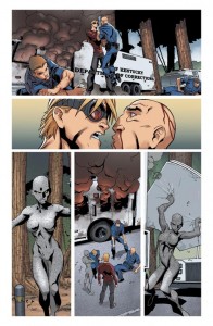 Part way through the book the art picks up in quality. The Sam Guthrie/Paige and Wolverine/Rao pages were better drawn and infinitely more colourfully detailed than the rest of the art in the book. With the Guthrie art though there wasn’t anything that particularly stood out; the layout was basic and uninspired. The Wolverine art however was the best collection of work in the book, using a much more dynamic panel structure, complemented by some relatively well executed action scenes with Wolverine leaping at security. This artists’ models were much more expressive than the other artists’ contributions in the book and at times reminded me of Ivan Reis’ work on a variety of DC books. I must say too that one of the better panels were the close-ups of Wolverine as he’s perspiring and gritting his teeth. Both of these look really good.