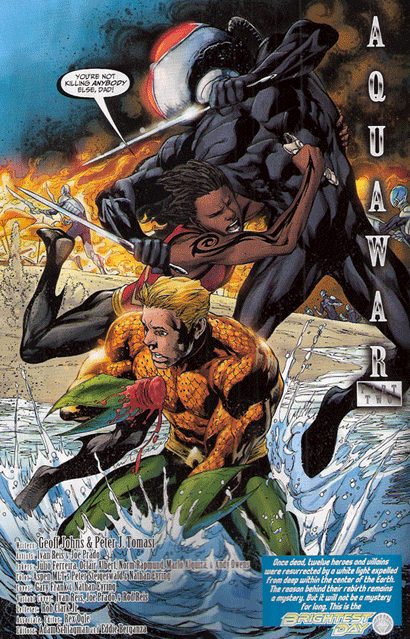 With the threat over, Aquaman gathers his allies and they talk about being outcasts to both the surface and underwater worlds, but no matter what they’re together; none of them is truly an outcast. Aquaman and Mera embrace, activating a message from the white entity. It tells Aquaman that his mission is accomplished and his life is returned. Brand arrives under the sea, and is forced to blast Aquaman with his white lantern ring. Aquaman disappears in a cloud of white dust as a distraught Mera screams his name at issue’s end.