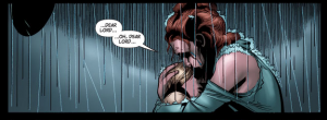 Avina’s colouring though doesn’t come across that well in some pages. Although there are pages where it’s quite good, in the scenes where characters are crying for example, the tears are coloured in such a way that it looks like they’re kind of just layered over top the character’s face; caked on and feeling unnatural. It looks more like they’re wearing paint, the tears just feel lifeless and its hard to establish a connection with them and their emotional state. What I liked about the art is the minor nuance within the book regarding the weather. Throughout the book it’s raining constantly, even when Bruce has travelled further into the future (his past). It’s both a nice maintenance of continuity throughout the issue, while also enhancing the thought that Bruce is being forced to live through a succession of lives and deaths. It’s only natural then that the weather and his wounds would accumulate and continue forward. Despite some misgivings I have about Jeanty’s artwork and some poor colouring, this was a nice touch to the issue.