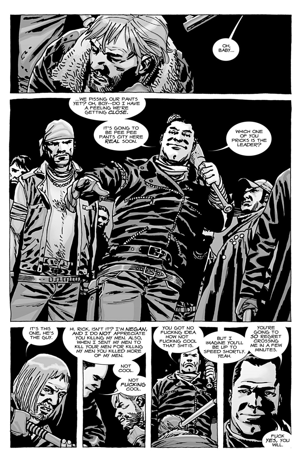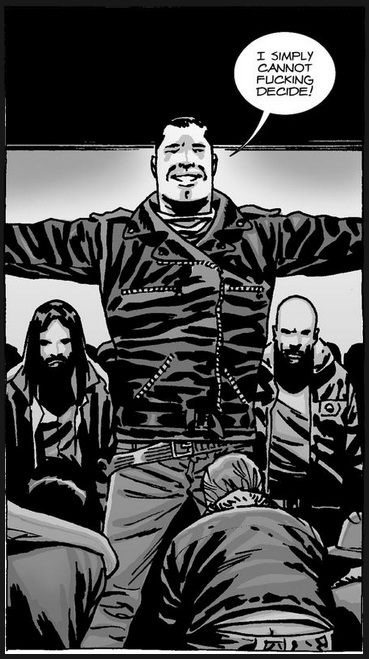 While the plot is conceptually high-handed and well thought out, the writing in the issue is poor upon Negan’s appearance through to the end. Where the opening pages are well-paced with dialogue suitable to the conversation between the characters — Rick’s defeatism, anger and apathy healthily apparent throughout — Negan’s speech is contrived, redundant and forced. Negan, who’s very much an over-bearing jerk, repeatedly emphasizes that things are changing in this landscape he now wishes to rule; a point he highlights both before and after the violent beating. The dialogue’s redundancy gives Negan a very single note personality, as though he has nothing else relevant to say or that Kirkman didn’t have enough script to fill the final pages of the issue. While the first offering works on its own, the second helping of Negan and Rick’s conversation is forced and adds nothing more than reinforcement of the principle of the societal order’s shift. This makes the final pages tedious to read, creating an underwhelming ending to what at least conceptually should have been a defining shift in the book’s direction.