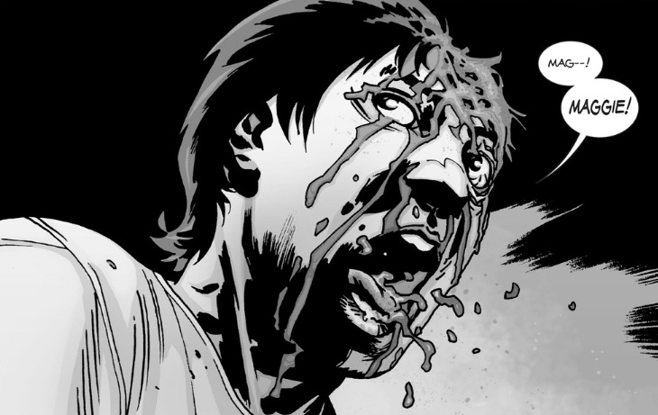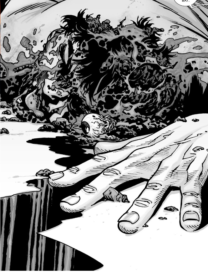 Adlard’s art is a central pillar of this series, animating the horror-bound nature of Kirkman’s script with gasp-worthy, stomach churning visuals. Glenn’s death offers a particular case where the artwork works on two fronts to emphasize the reality of humankind’s capability to be innately violent towards its number, while being dually horrific for its own sake. His death plays out over several pages where his demise inches incrementally closer to reality as his friends can only watch on, while the physical toll caused by Negan and his weapon are demonstrated visually with each head-splitting crack. Accompanying Glenn’s death is an equally chilling expression of glee on Negan’s face as he horizontally swings the bat across Glenn’s face, shattering his jaw without batting a lash. The act is then finished in a series of silhouetted panels where Negan repeatedly pummels and pounds Glenn until there’s nothing left of his head but mush. As a whole, the art works well in its black and white presentation, combining with Rathburn’s greying tones to add a classic horror feel to the book. The Walking Dead wouldn’t be as appealing had it any colour, making the artwork functional for the story. Adlard provides more than these horror elements mind you; in several instances throughout he combines with Wooten to manufacture seamless reading for the eye. Early in the issue as Rick and Glenn share a conversation, Glenn’s speech carries over from one panel in which he is sitting upright to the next as he lays down in the back of the car, ending with his head resting upon the backseat. Another example of Adlard’s work is demonstrated upon the arrival of Negan’s crew when they use a snare to drag Rick from the roof of his group’s car to the ground, transitioning to two panels of Rick gasping for air and thrashing his head from side to side in an attempt to break free. His strained facial features are presented with precision with each fighting, vain attempt to breathe. It’s a continually welcome addition to the greater presentation, communicating the anger, sadness, violence, smugness and arrogance of each member of the book’s cast. Another intuitive piece of the art is Wooten’s sound effects lettering, especially during Glenn’s final moments where the lettering effects become visually less defined with each decisive, head-splattering blow, ending with a gooey mass of letters synonymous with the remnants of Glenn’s skull.