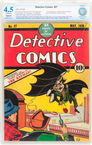 Detective Comics #27, DC Comics, May 1939 Graded by CBCS at Restored 4.5 Extensive Amateur sold for $167,300.00.