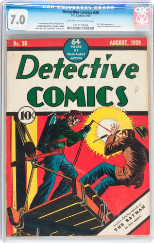 Detective Comics #30, DC Comics, August 1939 Graded by CGC at 7.0 with Off White to White pages sold for $13,145.00.
