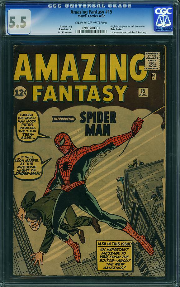 Amazing Fantasy #15, Marvel Comics, August 1962 Graded by CGC at 5.5 with Cream to Off White pages sold for $20,055.00.