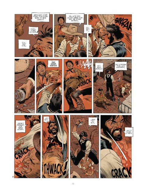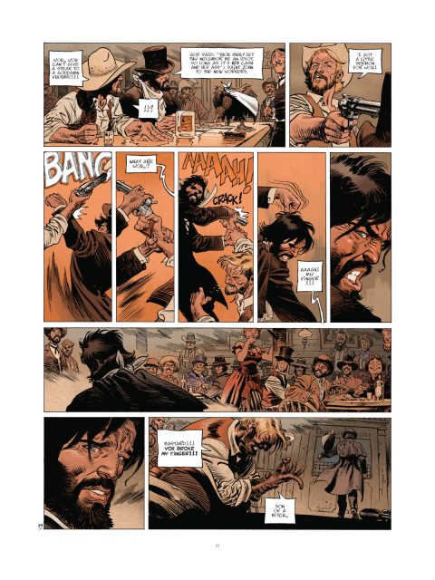 Meyer’s art style is a wonderful mixture of North American and European styles. Naturalistic characters and environment, full of detail. Expression is so detailed through faces and body language, the reader is never left in doubt. Colour is at play throughout, intense background shades to accompany action or violence. The old west was a drab place of dirt and timber, but there’s never a dull panel here.