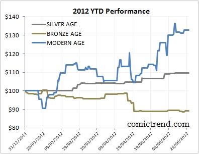 Here’s a comparison of the Silver Age, Bronze Age, and Modern Age performance year-to-date. All indices have been set to a starting value of $100 for a direct comparison.
