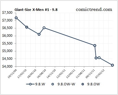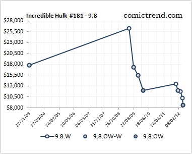 The usual suspects keep dragging down our Bronze Age Index. Giant-Size X-Men #1 9.8 continues its free fall with an auction finishing at approximately $4,000 in April. Incredible Hulk #181 9.8 is still struggling, down 67% from its 2009 high. Perhaps it will break $8,000 soon!