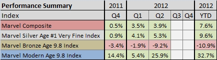 During the second quarter, most key historical Marvel issues continued to appreciate in value. Our Marvel Composite Index, which combines our Silver, Bronze, and Modern indices, gained 7.6% during the first six months of 2012. The Modern Age has been by far the best performing Age, rising 32.7% year-to-date. The Silver Age has been no slouch, logging a respective 9.6% gain. High grade Bronze Age titles continue to struggle, down 10.9% for the year. Looks like I was a tad premature in calling for a bottom!