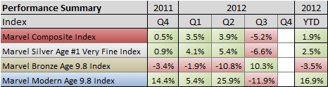 What goes up must come down and what goes down… must come up! That was the story for comic values during the third quarter of 2012. The two hottest Ages so far this year, the Silver and Modern Ages, declined during the quarter. The down-and-out Bronze Age popped 10.3% after falling 2% in Q1 and 11% during Q2. The Marvel Composite Index, which combines the Silver, Bronze, and Modern Age indexes, fell 5.2%. The table below summarizes each index’s performance during the quarter and for the year: