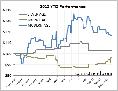 Here’s a comparison of the Silver Age, Bronze Age, and Modern Age performance year-to-date. All indices have been set to a starting value of $100 for a direct comparison.