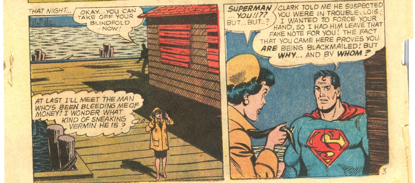 Our story kicks off with Lois descending some stairs into a dirty building where a hooded figure stands playing a movie on a reel threatening Lois with some kind of insidious blackmail. Immediately, we jump to later on where we see Lois leaving the bank with her life savings in a box and throwing it out the window of her speeding car to leave it in her drop spot. As she continues to make these payments to her blackmailer and she becomes more frugal in her day to day life, she makes the decision to sell her Superman memorabilia for money. As she’s packing up her stuff to be sold, she’s caught by her sister Lucy who immediately runs off to tell Clark about her wheelings and dealings. You know, Lucy, maybe you should be happy that your sister is finally getting over her insane crush over a man who has put her in the path of danger so many times and can’t help but two-time her all the time. After being contacted once again for more money by a note left on her typewriter, Lois gets an advance from Perry on her pay and goes to meet her blackmailer at the docks.