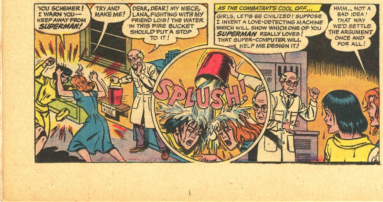 The Story: Our tale of love opens up with Lana inviting Lois over to the TV studio to attend a party for a group of famous authors with the promise of handsome authors all waiting to sweep her off her feet. Lois thinks that Lana is just trying to get her to give up on her stalker like obsession with Superman but shows up anyways. But lo and behold! That hussy Lana’s true motives for having Lois attend was to show her up by having Superman show up and demonstrate the capabilities of a computer while she acts as an announcer. Oh but Lois Lane wasn’t going to take that sitting down! That ain’t how crazy Lois operates. After the show, Lois shows up at the professor who invented the computer’s lab to find Lana and immediately begins cat-fighting with her, hair pulling and all that sexy jazz. The fight is broken up with a bucket of water courtesy of the Professor who turns out to be Lana’s uncle who realizes that these girls are crazy and that he’ll build a love tester to determine the answer for once and for all. Lois then storms off to meet with her sister who gives her a contest application she filled out to win a car from the Daily Planet. Remember this, it will come into play later!