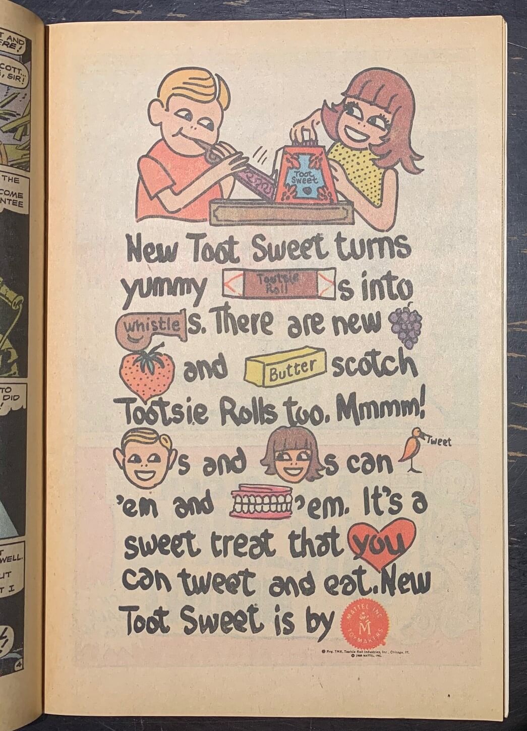 This ad makes absolutely no sense! I remember actually getting mad at a few ads I’ve heard on the radio and seen on TV, after seeing the ad I’d be sitting there trying to figure out what they were trying to say, what were they selling? Sometimes these hipster ad guys are too smart for their own good, my guy in the bathtub could write better ads. Case in point this ad from House of Secrets #82, November 1969, what are they selling? Tootsie Rolls? What’s a whistle? Is this a toy from Mattel? I may not be the brightest bulb in the drawer but I’m not sure this ad generated much business.