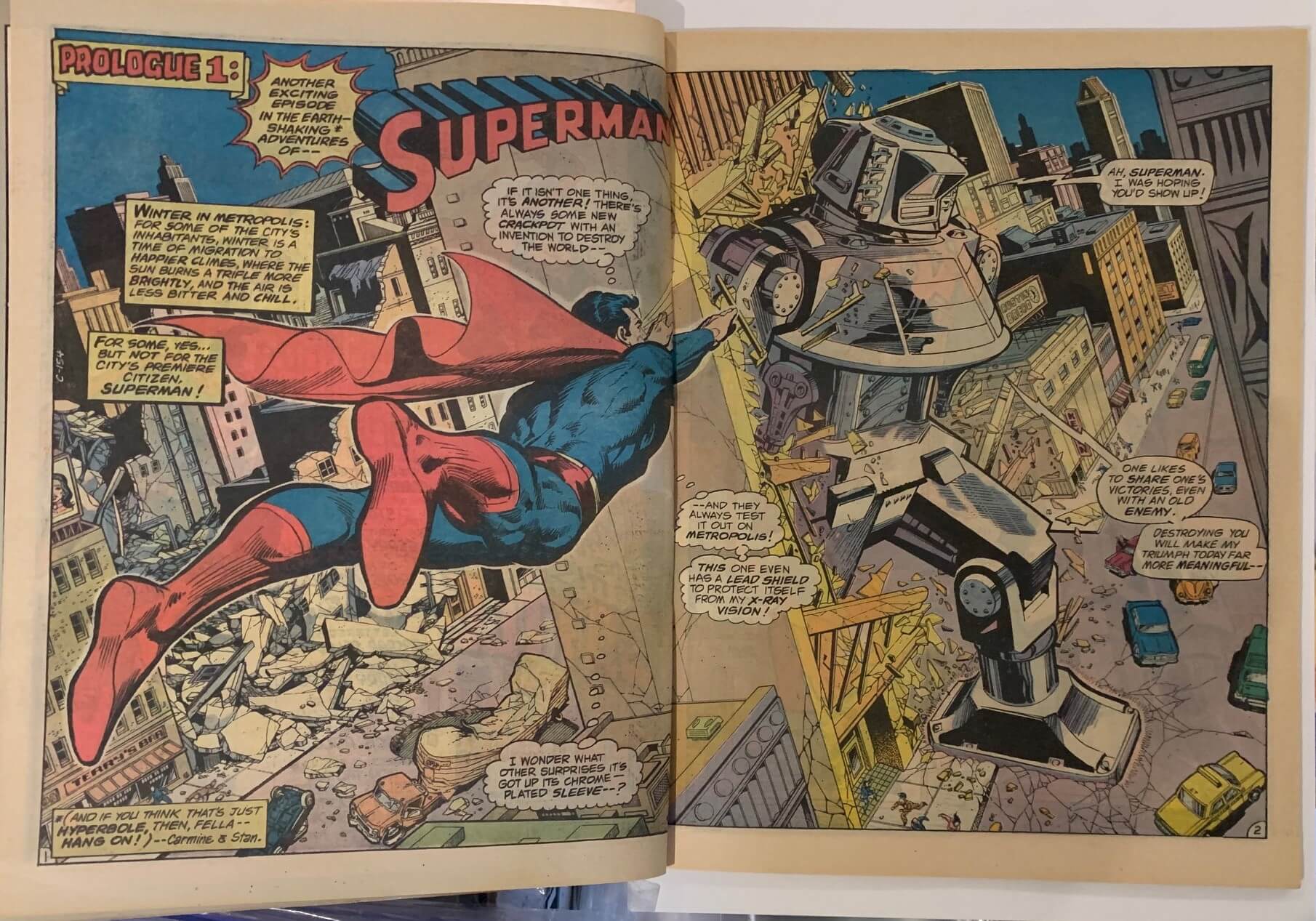 The splash of the week comes from the 1976 Superman vs. Amazing Spider-Man treasury edition. This great splash is credited to Ross Andru with Neal Adams getting Superman redraw credits. This is a great action scene, nots of details in the city scape and a super cool giant robot trashing the place. The only thing better than a two-page splash is a two-page splash in a treasury edition!