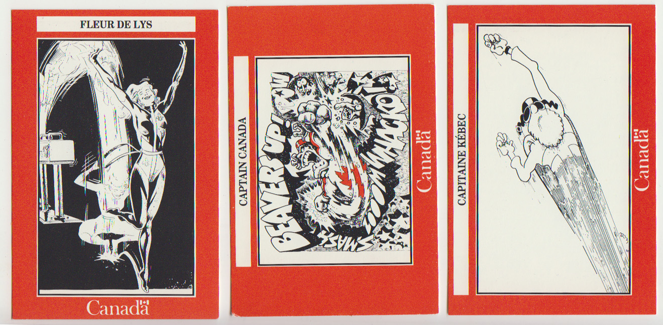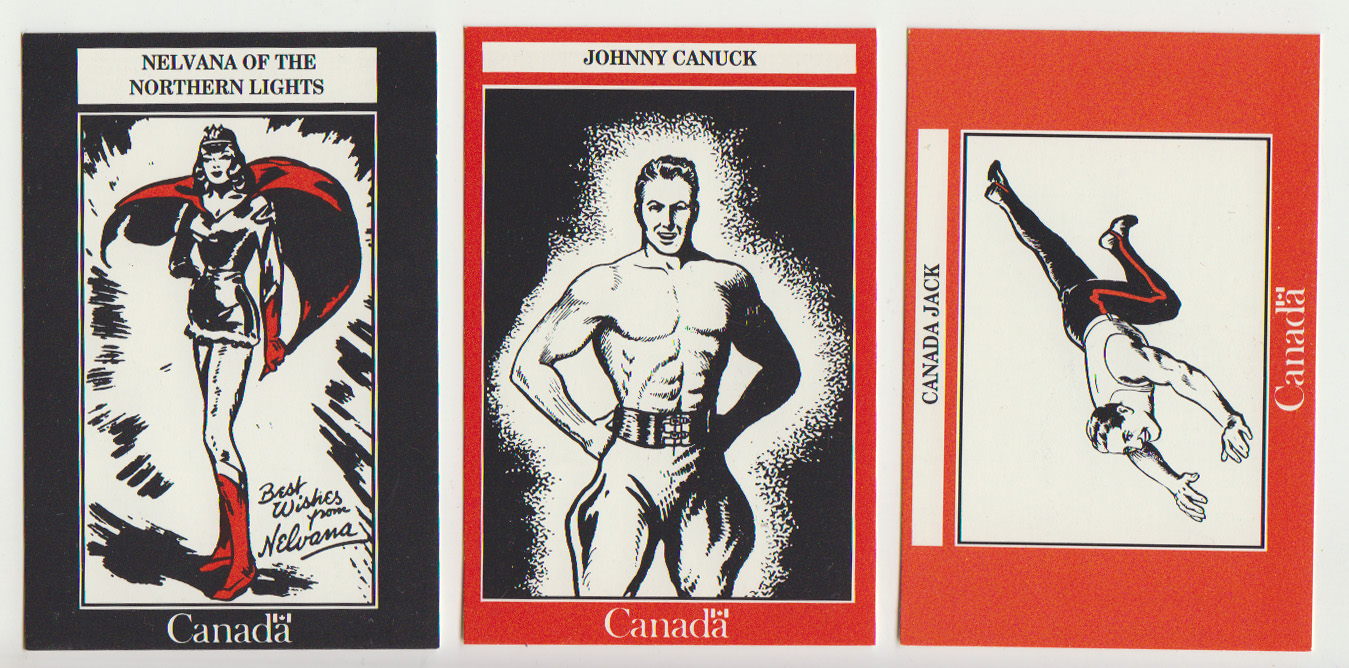 This, then, was a small and limited set of cards that now seems hard to find. Should be able to put out a new set (I was thinking of a basic set that showed a colour picture of the hero with a reference to that hero’s creator/chief artist, powers, and first appearance—all this in English and French) what should the scope of it be. Should we include those Canadian heroes from the 70s to the present? How many cards should be in the set? Should we include special limited insert cards (eg., photos of the artists, signed cards by the artists for more modern heroes, an enhanced card—3D, embossed, laser?). How many cards to a pack? And so on…. It could be a grand and memorable set. What do you think?