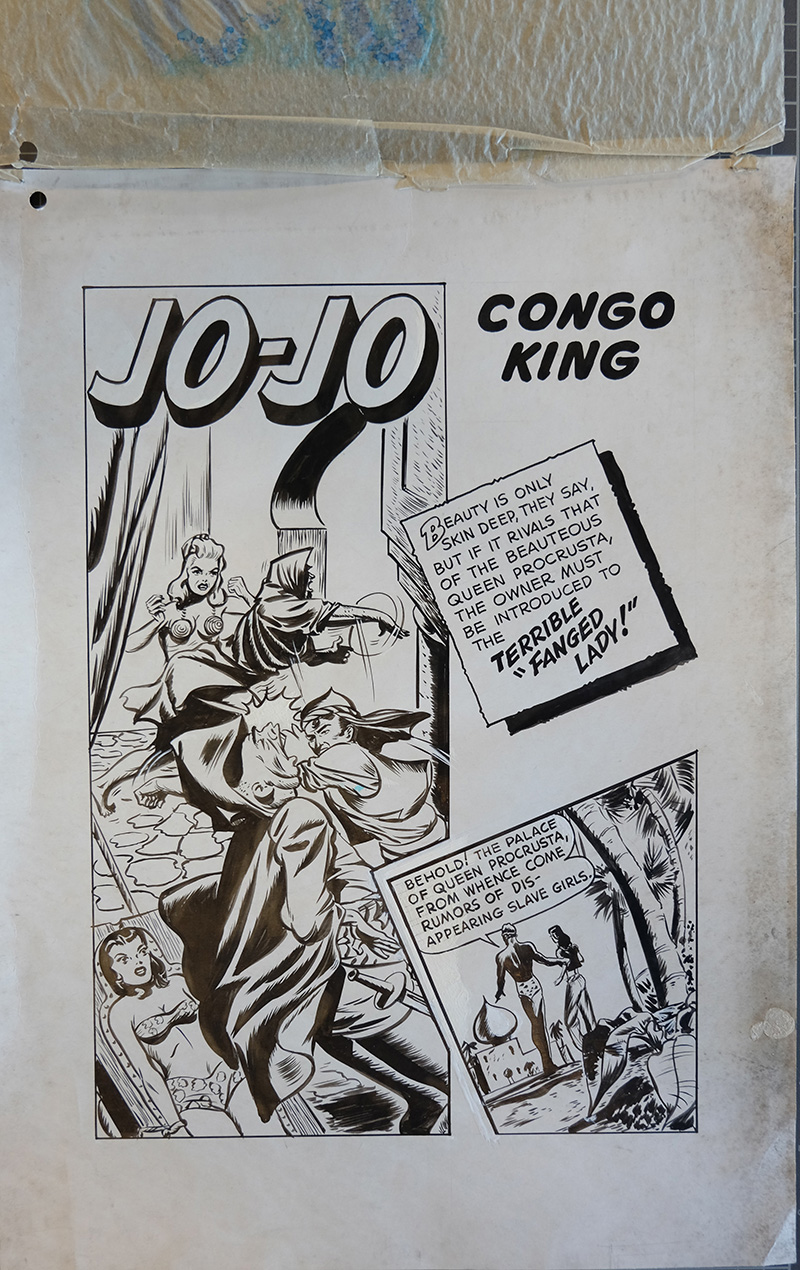 Here is one peculiar page. It’s a Jo-Jo Congo King original but what is it doing in the Bell Archives. The title of the story is “The Terrible Fanged Lady” and the closest I can find in Jo-Jo Comics appears in issue No. 9 and its title is “Death of the Fanged Lady” and it’s from December, 1947. I hope that we can identify this splash appearing in a late forties Bell book. It certainly looks like a re-draw of the script from the Jo-Jo Comics #9 story.