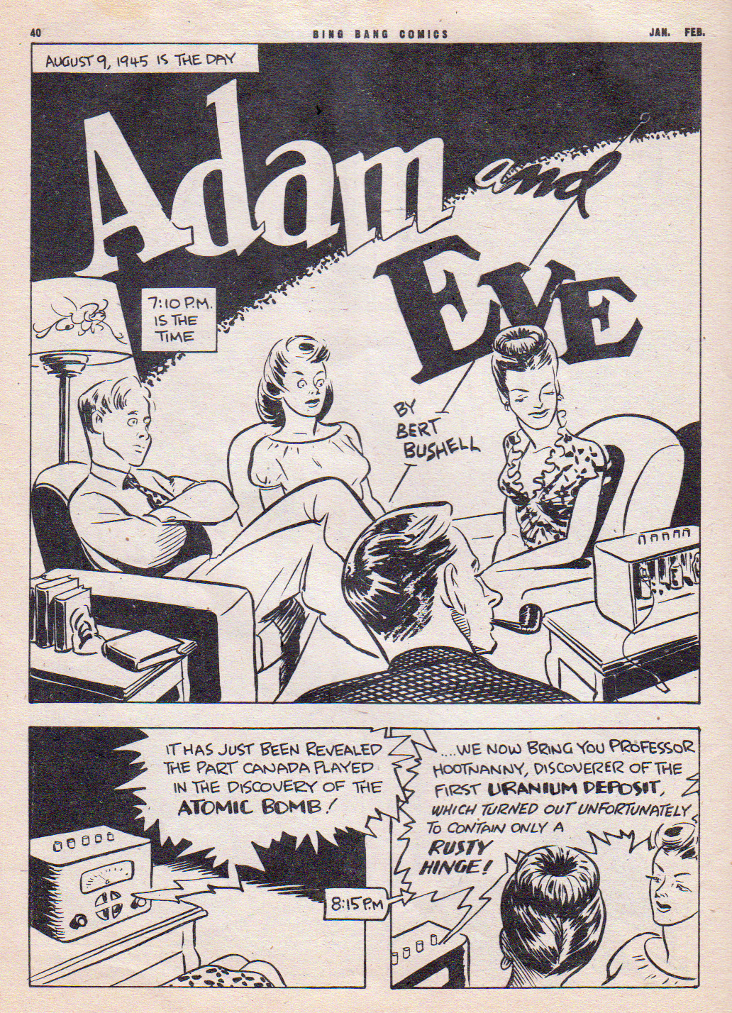 During the last year or so of Maple Leaf comics, Bushell created a new strip named “Adam and Eve.” It was about a young married couple in which the husband always seems to get himself into a jam of some sort. It probably reflected a lot of the radio comedies of the time and foreshadowed numerous TV sitcoms to come.