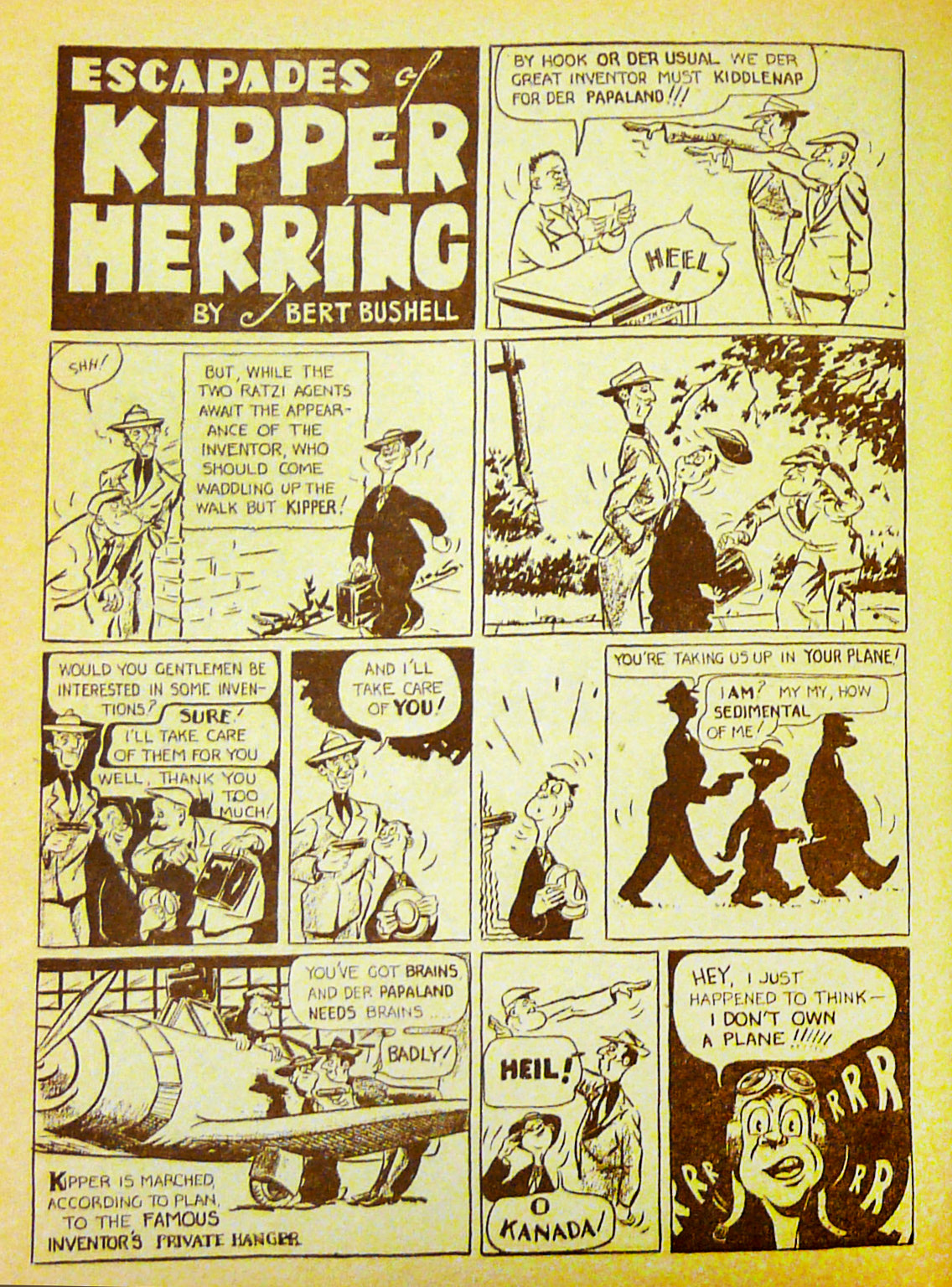 At this same time, Bushell began doing the artwork on a strip in Lucky Comics (Vol. 1 No. 3) called “Ether Escapades” which originally had been created by Herb Frew and drawn by Vernon Miller in the very first issue of the title. It dealt with the exploits of Canadian Air Ace Phil Dauntless who is asked by the Nazis to be a test pilot for their new experimental plane because it was considered too dangerous to risk one of their own pilots. Predictably, Phil takes off with the plane and escapes when he finds out that it is actually an amphibious plane. In the next few stories, this plane is modified and made more streamlined, almost looking like one of the Flash Gordon serial rockets. Phil Dauntless comes to refer to it as his amphibious “Fish Plane.” Bushell soon took over the writing of the strip as well.