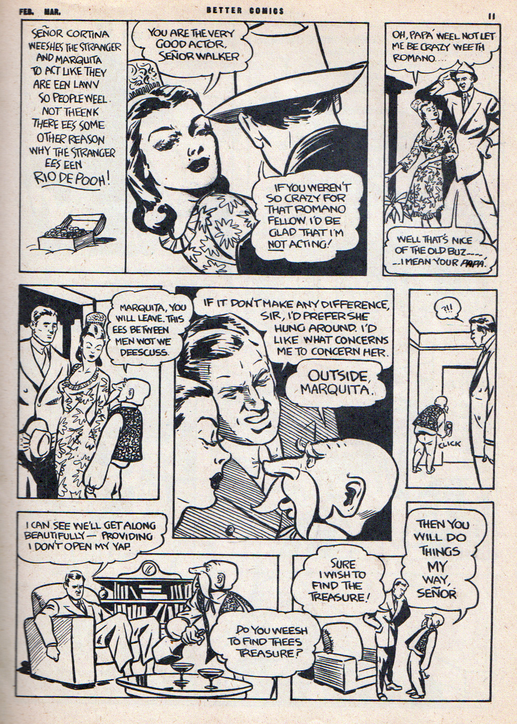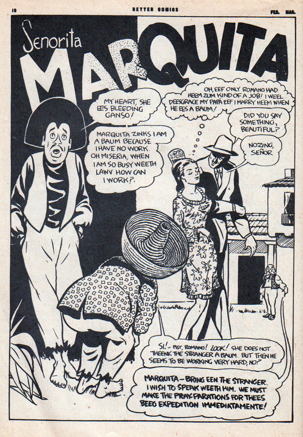 Late in 1944, Bushell came up with a strip called “Senorita Marquita” which first appeared in Better Comics Vol. 3 No. 6. The story was about Mexican layabout Romano and his girlfriend who would like to marry him but can’t because her father won’t give his permission unless Romano has a job. The series switched over to Lucky Comics in 1946.