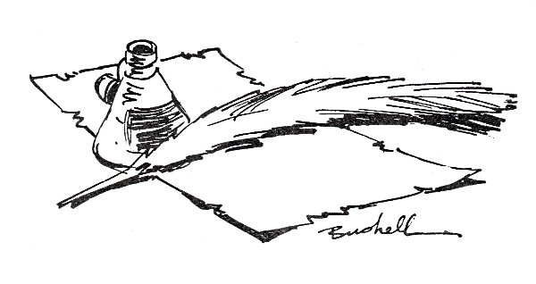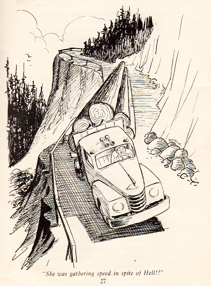 Swanson was also known as the “Bard of the Woods” and he created a series of poems while he travelled around B. C. logging camps as a forestry safety inspector. Bushell illustrated this slim volume with just over a dozen graphics that supported the poetry. Here are a couple of examples: