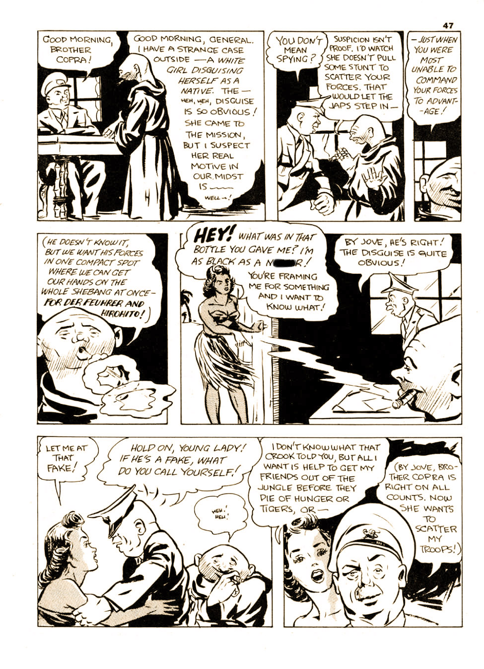 Before we go any further, there are a couple of important Bert Bushell panels to which I want to call attention. The first is from the second-to-last “Ether Escapades” story from Lucky Comics Vol. 1 No. 8, just two issues before Phil Dauntless becomes the Black Wing. Phil and his co-pilot “Happy” found out, in the previous issue, that Phil’s ‘girl-interest’ “Dizzy” had stowed away on their plane. Now, due to mechanical difficulties, they are forced to crash their plane, the “Flying Fish,” into the impenetrable jungles of Malay (I’m not sure where Bushell thought this was, but if it refers to the Malaysian Peninsula and the area just above Singapore, the natives would be more Oriental looking than African as depicted in the story.) The girl, Dizzy, is the first to wake up and heads through the jungle until she comes across a village with a mission. There a suspicious Caucasian monk named “Copra” who insists that she use a special oil on her skin to protect it from the fierce tropical sun. In a few minutes, the oil has an unexpected effect and turns her skin much darker resulting in the sequence on the page below:
