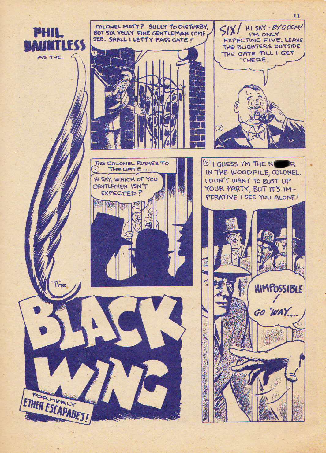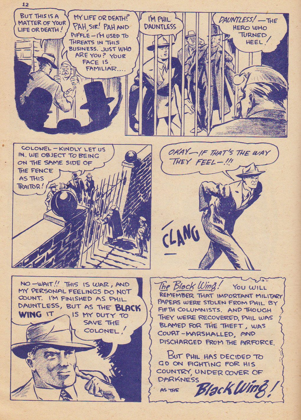 In Lucky Comics Vol. 1 No. 10 Bert Bushell transforms Phil Dauntless into the masked hero, “The Black Wing.” This happens because Phil is framed by Axis spies for stealing some important military papers. He’s court-marshalled for this offence and drummed out of the Air Force. Phil chooses to go on fighting fifth columnists by taking on a masked identity and becomes “The Black Wing.” I’m not sure how far the series went but the character seems to have disappeared from Lucky Comics by the end of the second volume perhaps lasting only ten or so issues.