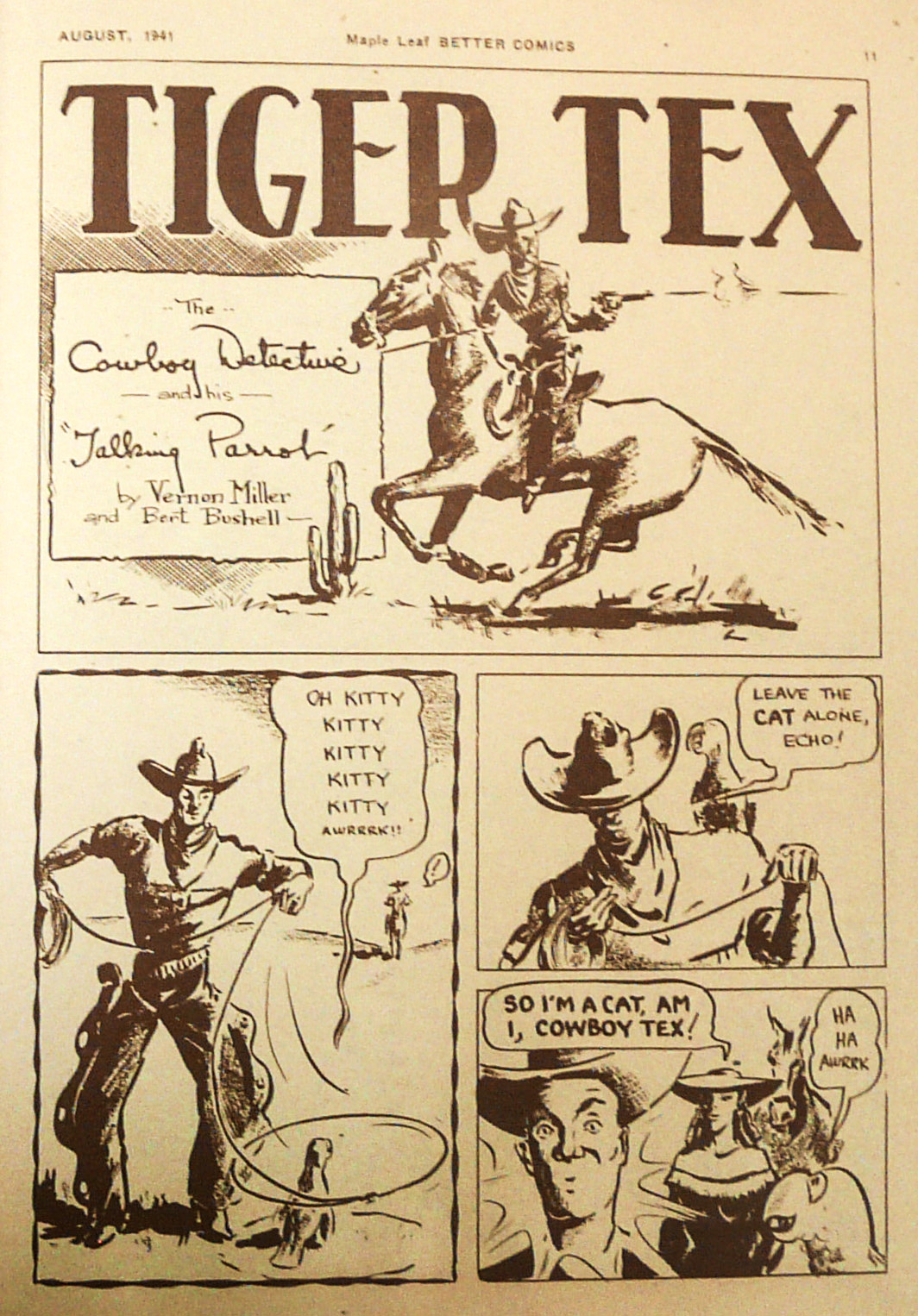 In issue No. 6 of Better Comics, Bushell took over the illustration of Vernon Miller’s cowboy strip “Tiger Tex” whose sidekick was a newly named talking parrot called “Echo.”