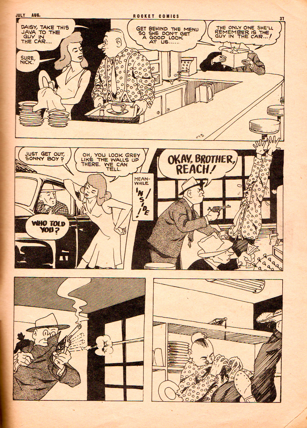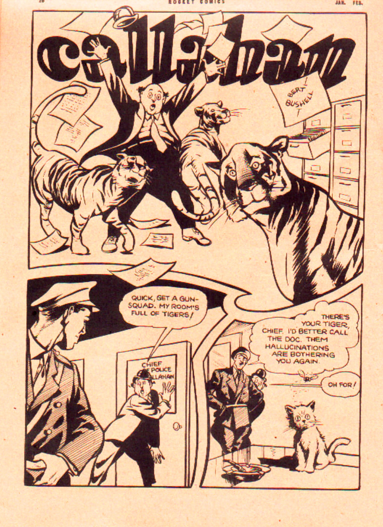 In Name-It/Rocket Comics, Bushell began with a mystery strip called “The Case of the Lost Mind,” but by issue No. 6 of the title (the one with the iconic red Cosmo cover by Bushell) this strip was gone and replaced by a detective strip featuring a rotund, bowler-hatted police sleuth called “Callahan.” For me the “Callahan” strip was where Bushell was his most Eisner-ish in his perspectives and in his story telling. The strip lasted until the end of the Rocket Comics run.