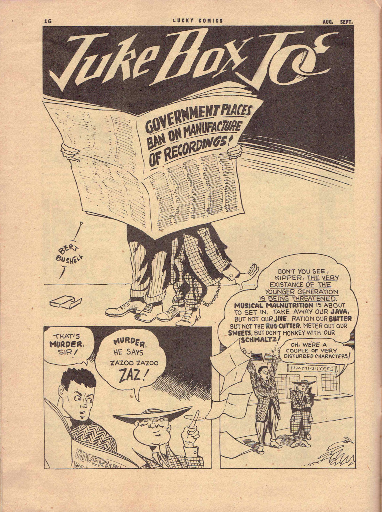 In 1943, Bushell had a short-lived strip full of music references and related “jive talk” called “Juke Box Joe” in Lucky Comics. Joe’s sidekick and main jive talker was none other than the star of Bushell’s first strip, Kipper Herring.