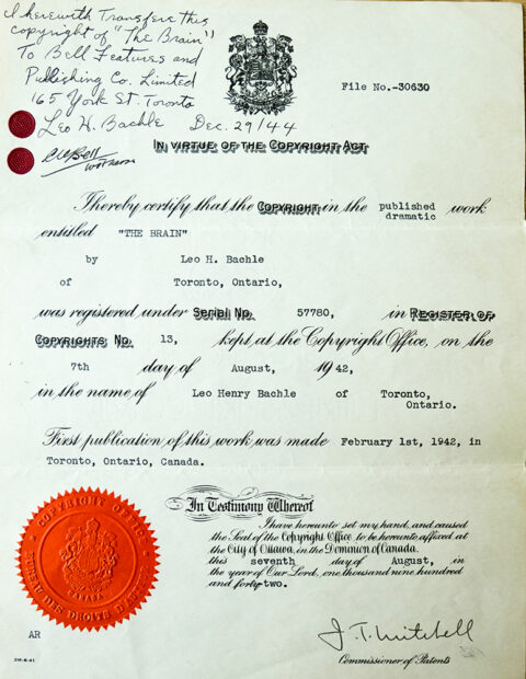 The copyright sheets for the characters Johnny Canuck and The Brain are notable for the fact that, though copyright was originally obtained for both characters in 1942 on behalf of Leo H. Bachle, there is a handwritten note from Leo in the top left of each document dated Dec. 29 1944 that transfers this copyright to Cy Bell. It’s fun to speculate why Leo Bachle would have done this, but it was around the time he left Canada and Bell Features to try his luck in the U.S.