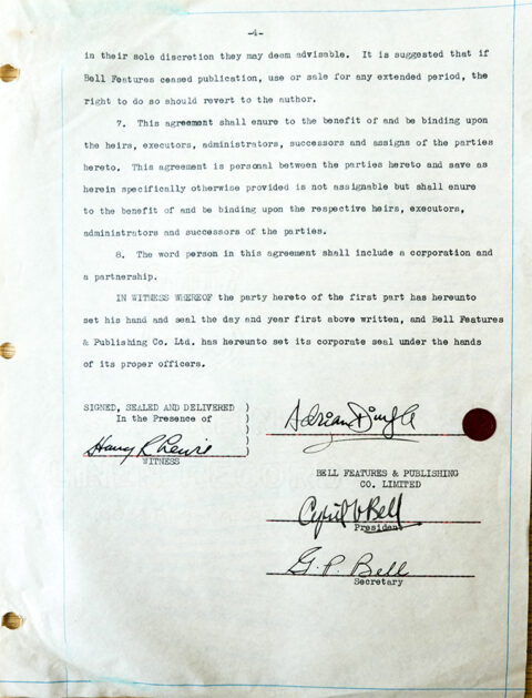 The contract is dated February 22 1946 and, like most of the documents in the box, is from the post-war period (1945-47), late in the existence of Bell Features as a publisher of original material Canadian comics. The handwriting that fills the open portions of the contract is Cy Bell’s because we can compare it with some of the signed, handwritten letters that also come out of the box. The slightly calligraphic style looks to have been done in fountain pen (Do younger collectors even know what one of these things is?) which, judging from other samples of handwriting in the box, seems to have been Cy Bell’s preferred writing instrument. I can visualize his small, gaunt form rushing around the Bell Features offices with a couple of these, perhaps gold-plated, in his inside jacket pocket ready to be whipped out, unscrewed and put to work scratching out impromptu notes or messages.
