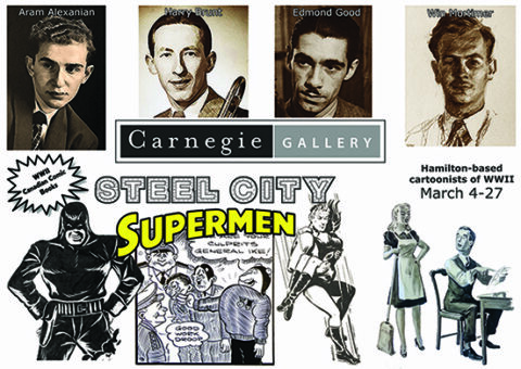 The March 2022 exhibit I’ll be co-curating with John Farr on four of the WWII comic artists who were based in Hamilton, Aram Alexanian, Harry Brunt, Edmond Good, and Win Mortimer, is still set to go and I’ve put together a postcard design to announce the show. Still tweaking it up a bit, but here it is: