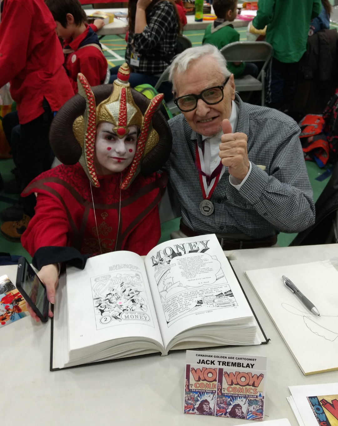 To finish off, I just recently received a couple of pictures of Jack Tremblay, one of the original Bell Features artists who are fortunately with us. The pictures were sent by Jack’s son Rick Trembles and show Jack having a great time at the April 2nd Montreal Fantasticon. Jack will be 91 in a couple of weeks and worked for Bell Features 75 years ago.