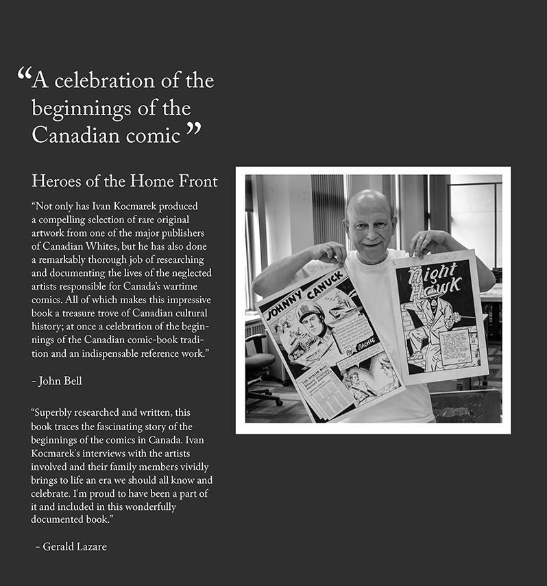 Ivan, Greetings from New Zealand – from an ex-pat Canadian (just to be clear). Regarding publishing, a mate here has published a number of high quality hardback travel books through a US company, Blurb. As publisher, he has complete control of all aspects of the book – pictures, language, format, etc. I know you’d prefer a publisher to publish but necessity is the mother of invention. Please put me down for a copy of Heroes of the Home Front. I too would prefer a hardback version. Cheers. Mike PS I do have that bunch of well-read Anglo-American comics if you ever find an interested party.