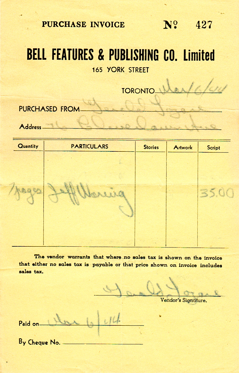 Back a couple of weeks ago when I picked Gerry Lazare and his wife Setsuko up to make the drive down to Fan Expo for our presentation, Gerry presented me with five carbon copies of his pay invoices for work he’d done for Bell Features in 1944. Here’s one to share with you and it’s amazing that Gerry would have saved these from almost 75 years ago. What a treat! I can’t thank Gerry and Setsuko enough for the amount of encouragement and support they have given me over these past couple of years.