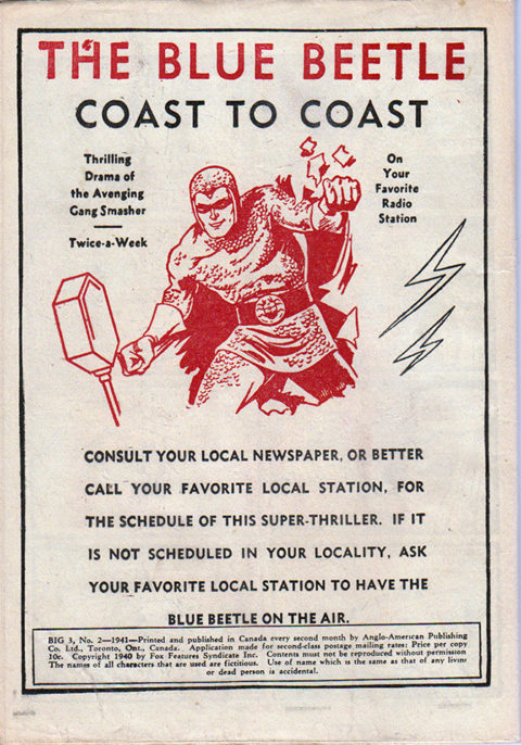 We all know that the first Canadian comic book, Better Comics Vol. 1 No. 1, came out with the cover date of March 1941 and that a tabloid-sized, pseudo-comic book, Robin Hood Comics Vol. 1 No. 1, came out with the same cover date. However, far fewer people know that Toronto’s Anglo-American also published a set of four black-and-white reprints of American Fox issues with that same cover date. Reprinted as facsimiles of the American issues, but with two-colour covers, were Big 3 Comics No. 2, Fantastic Comics No. 16, Mystery Men Comics No. 20, and Weird Comics No. 12 (Big 3 Comics No. 2 actually had no cover date, but the rest were all March 1941).