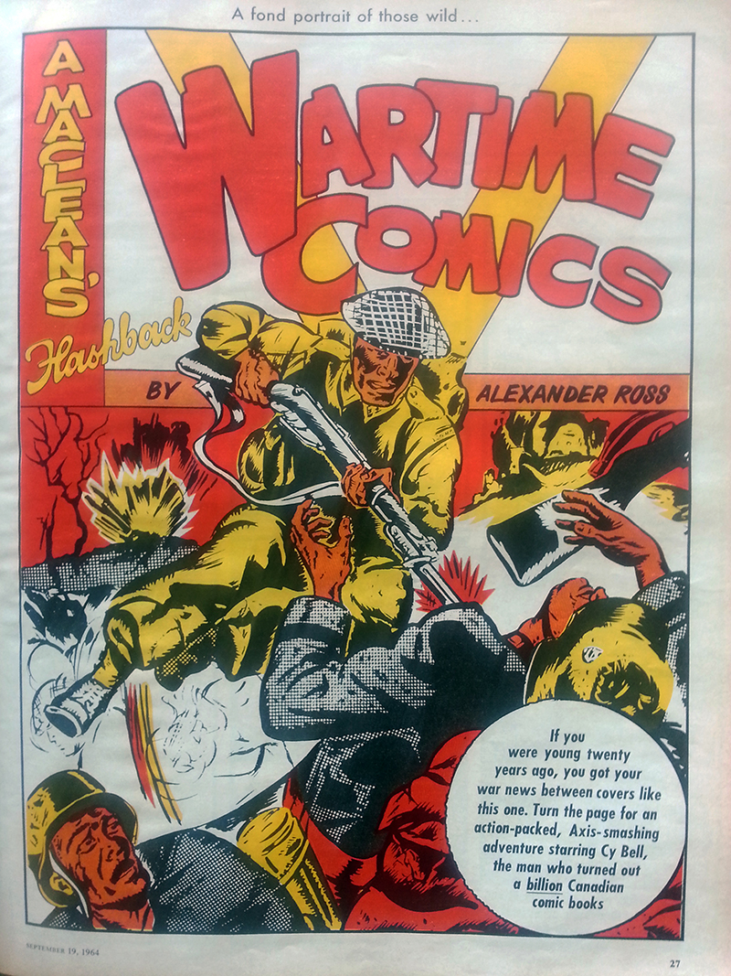 Twenty years after the short run of the war-time Canadian comics, Maclean’s Magazine published an article by Alexander Ross called “A Fond Portrait of those Wild Wartime Comics” (Maclean’s Magazine Sept. 19, 1964), which is essentially an interview with Cy Bell and takes as its topic the Bell Features comics, makes absolutely no reference to Nelvana at all but has prominent pictures of Johnny Canuck, The Brain and The Invisible Commando.