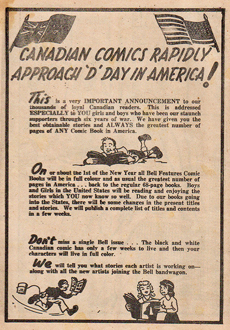 Cyril Bell’s hopes for his comics were reaching far and wide at the end of 1945. Take a look at his announcement on p. 8 of Dime Comics No. 27 which has a palpable aura of irony around it.