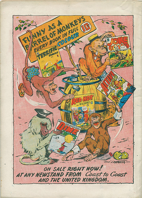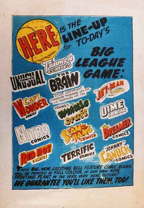 During that fateful year of 1946, Bell Features seemed to be the Canadian company that was trying to survive the most in the face of returning American comics. I say this because it seemed to have promised the most for the future. Look at the back cover for Commando Comics No. 22 and the identical back cover for Slam-Bang Comics No. 8 which, though it had a new René Kulbach cover on the front, was filled, ironically, only with American reprinted content.